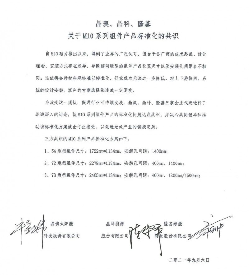M10硅片推出以來,得到了業(yè)界的廣泛認(rèn)可。但各廠商的組件產(chǎn)品技術(shù)路線、設(shè)計理念、安裝方式等存在差異,為下游的應(yīng)用造成一定困擾。為進(jìn)一步加強上下游產(chǎn)業(yè)協(xié)同,為系統(tǒng)設(shè)計安裝和客戶方案選擇提供便捷,晶澳、晶科、隆基三家企業(yè)經(jīng)坦誠深入溝通,就M10系列組件產(chǎn)品的標(biāo)準(zhǔn)化問題達(dá)成共識,并倡導(dǎo)全行業(yè)采用統(tǒng)一標(biāo)準(zhǔn),促