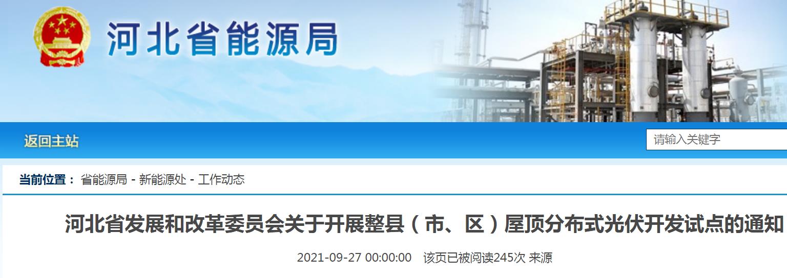 河北省發(fā)改委27日發(fā)布開展整縣(市、區(qū))屋頂分布式光伏開發(fā)試點的通知,明確了完成編制試點建設方案、光伏發(fā)電項目備案、光伏發(fā)電項目建設和試點評估驗收的時間和要求。