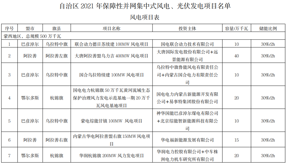 根據(jù)《國家能源局關于2021年風電、光伏發(fā)電開發(fā)建設有關事項的通知》(國能發(fā)新能〔2021〕25號)和《內蒙古自治區(qū)能源局關于2021年風電、光伏發(fā)電開發(fā)建設有關事項的通知》(內能新能字〔2021〕574號)要求,內蒙古自治區(qū)能源局組織專家按照公平公正、科學客觀的原則,對盟市申報的項目進行了客觀評分,優(yōu)選出了自治區(qū)2021年保障性并網(wǎng)集中式風電、光伏發(fā)電項目名單,現(xiàn)予以公示。