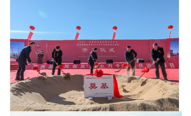 為貫徹落實(shí)習(xí)近平總書記的部署指示精神,作為國家第一期開工的大型風(fēng)電光伏基地項(xiàng)目之一,內(nèi)蒙古蒙西基地庫布其200萬千瓦光伏治沙項(xiàng)目于10月16日在內(nèi)蒙古鄂爾多斯市杭錦旗庫布其沙漠億利生態(tài)示范區(qū)“綠水青山就是金山銀山”實(shí)踐創(chuàng)新基地舉行開工儀式,標(biāo)志著我國光伏治沙、生態(tài)綜合治理進(jìn)入了新階段,是綠水青山就是金山銀山理念的有效實(shí)踐,又是落實(shí)碳達(dá)峰、碳中和目標(biāo)和黃河流域生態(tài)保護(hù)和高質(zhì)量發(fā)展的重要行動(dòng)。內(nèi)蒙古自治區(qū)能源局、鄂爾多斯市人民政府、杭錦旗人民政府與項(xiàng)目主體投資企業(yè)億利潔能、三峽能源和鄂爾多斯市、杭錦旗國資平臺(tái)負(fù)責(zé)人出席了開工儀式。
