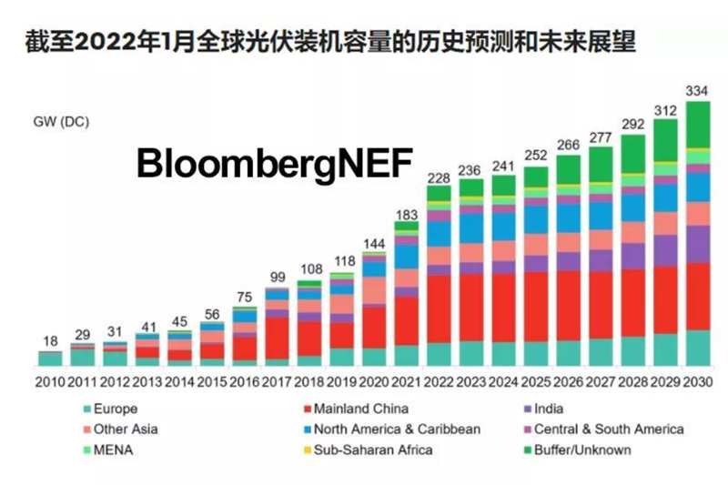 我們預計2022年將成為新建光伏裝機容量超過200GW的第一年,除非在媒體報道披露各國2021年裝機容量數(shù)據(jù)后該年份實際總量已超出這一數(shù)值。