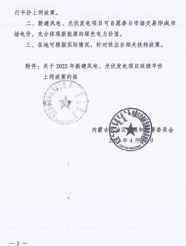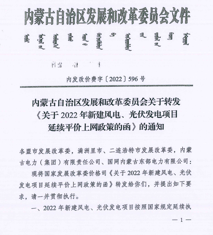 從科爾沁政府網(wǎng)獲悉:近日,內(nèi)蒙古發(fā)改委轉(zhuǎn)發(fā)國家發(fā)改委價格司《關(guān)于2022年新建風(fēng)電、光伏發(fā)電項目延續(xù)平價上網(wǎng)政策的函》的通知,通知明確,2022年新建風(fēng)電、光伏發(fā)電項目延續(xù)執(zhí)行平價上網(wǎng)政策。通知明確,新建風(fēng)電、光伏發(fā)電項目可自愿通過參與市場化交易形成上網(wǎng)電價,以充分體現(xiàn)新能源的綠色電力價值。