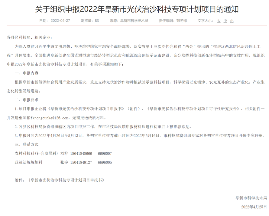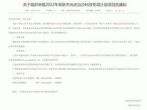 4月27日,遼寧阜新市人民政府發(fā)布關(guān)于組織申報2022年阜新市光伏治沙科技專項計劃項目的通知。根據(jù)阜新市新能源綜合利用產(chǎn)業(yè)發(fā)展需求,重點支持光伏治沙作物種植試驗示范科技項目,科學(xué)探索以光鎖沙、農(nóng)光互補的生態(tài)產(chǎn)業(yè)化,產(chǎn)業(yè)生態(tài)化轉(zhuǎn)型發(fā)展道路。