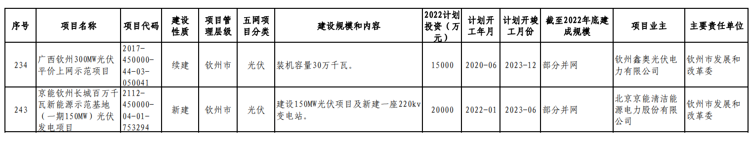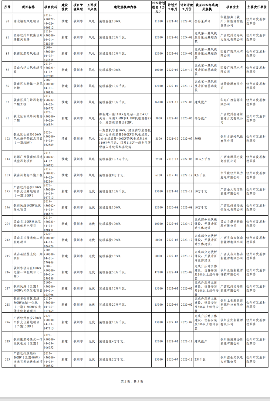 方案明確,加大力度解決可再生能源項目用林、用地、并網(wǎng)手續(xù)辦理困難問題,加快推動包括賓陽馬王風電場二期工程等52個風電續(xù)建項目建設(shè),防城港防城區(qū)灘營風電場一期(150MW)工程等41個風電項目年內(nèi)實現(xiàn)新開工建設(shè);加快推進廣西欽州市恒豐50MWp光伏電站等23個光伏發(fā)電續(xù)建項目建設(shè)。