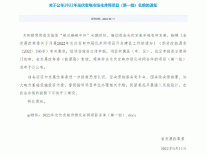 5月11日,江蘇發(fā)改委公布了2022年光伏發(fā)電市場化并網(wǎng)項目名單(第一批)。共計18個項目,總規(guī)模1.62GW。通知要求,各設(shè)區(qū)市發(fā)展改革委進(jìn)一步提高思想認(rèn)識,堅決貫徹落實黨中央、國務(wù)院決策部署,加大電力基礎(chǔ)設(shè)施投資力度,督促指導(dǎo)項目單位辦理相關(guān)手續(xù),抓緊委托開展接入系統(tǒng)設(shè)計,在依法合規(guī)的前提下盡快開工建