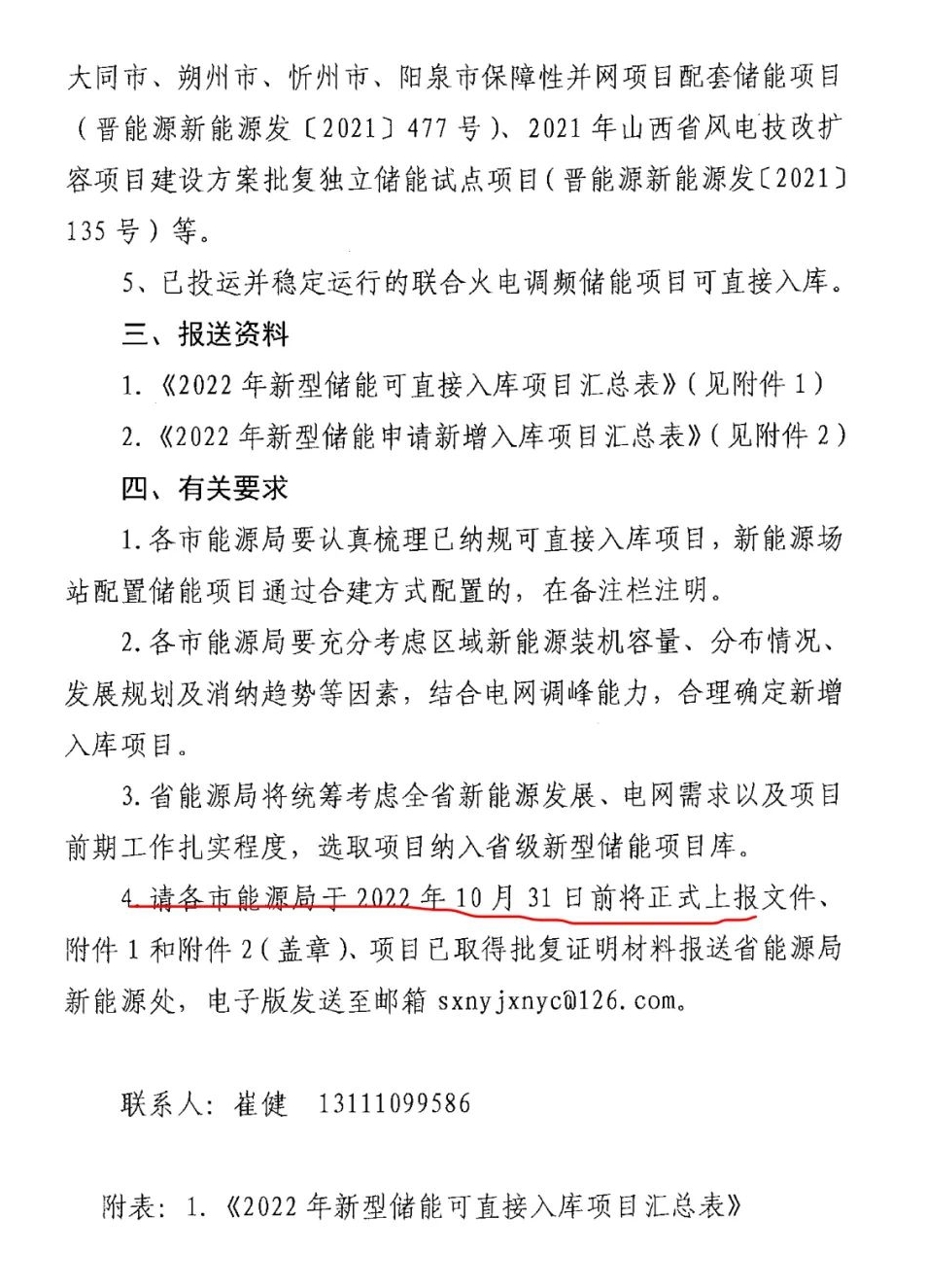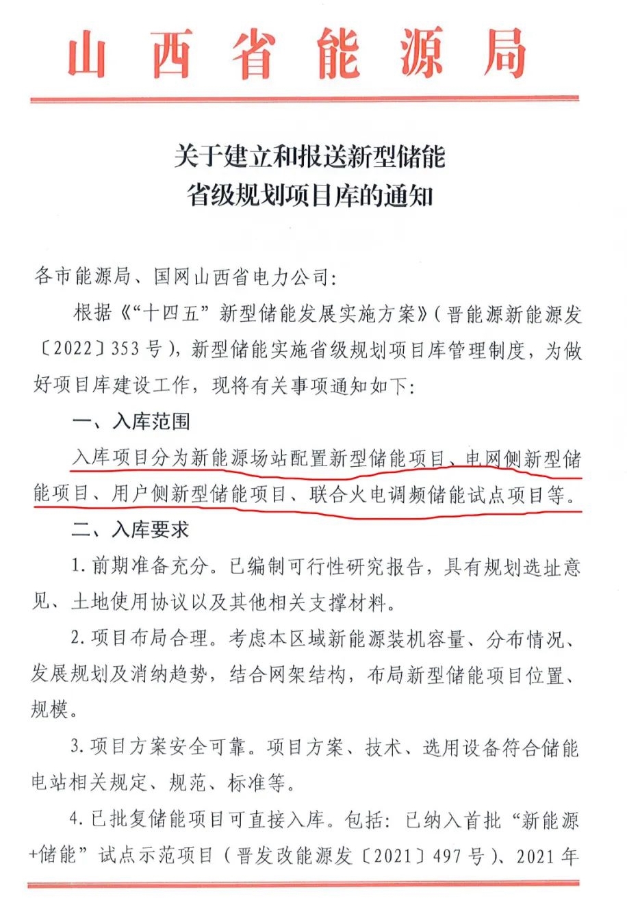 近日,山西省能源局下發(fā)《關(guān)于建立和報送新型儲能省級規(guī)劃項目庫的通知》。入庫項目分為新能源場站配置新型儲能項目、電網(wǎng)側(cè)新型儲能項目、用戶側(cè)新型儲能項目、聯(lián)合火電調(diào)頻儲能試點項目等。其中,已批復(fù)儲能項目可直接入庫,包括:已納入首批“新能源+儲能“試點示范項目(晉發(fā)改能源發(fā)(2021)497號)、2021