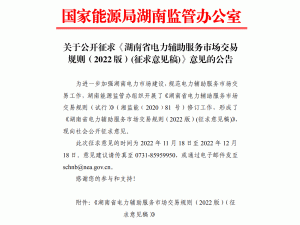 11月18日,湖南能源監(jiān)管辦發(fā)布關(guān)于公開征求《湖南省電力輔助服務(wù)市場交易規(guī)則(2022版)(征求意見稿)》意見的公告,為進一步加強湖南電力市場建設(shè),規(guī)范電力輔助服務(wù)市場交易工作,湖南能源監(jiān)管辦組織開展了《湖南省電力輔助服務(wù)市場交易規(guī)則(試行)》(湘監(jiān)能﹝2020﹞81號)修訂工作,形成了《湖南省電力輔