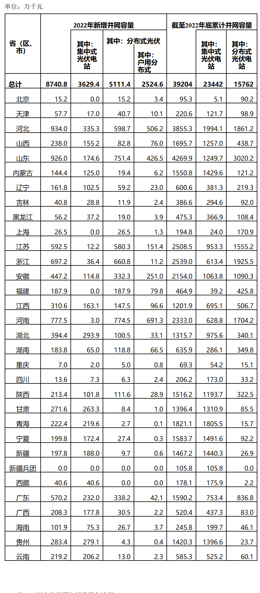 國家能源局今日發(fā)布2022年光伏發(fā)電建設(shè)運(yùn)行情況: 注:1.以上統(tǒng)計不包括港澳臺地區(qū)。