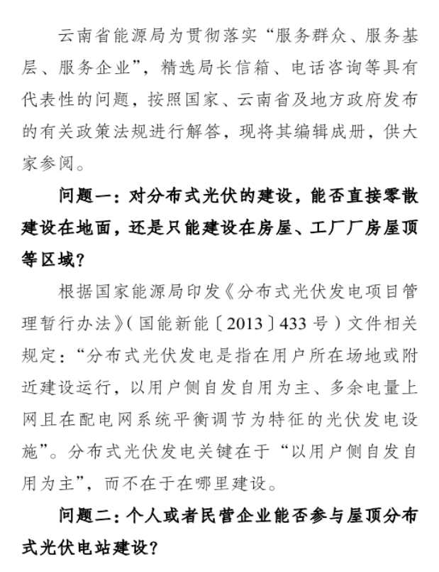 日前,云南省能源局印發(fā)分布式光伏常見問題解答,按照國家,云南省及地方政府發(fā)布的有關(guān)政策法規(guī)進(jìn)行解答,供大家參閱。全文如下: