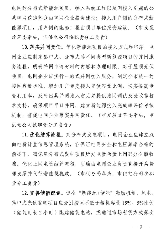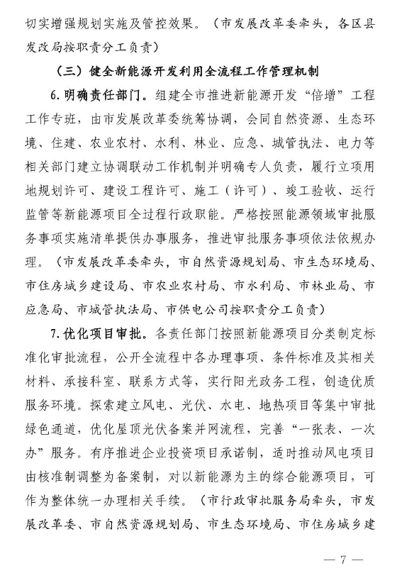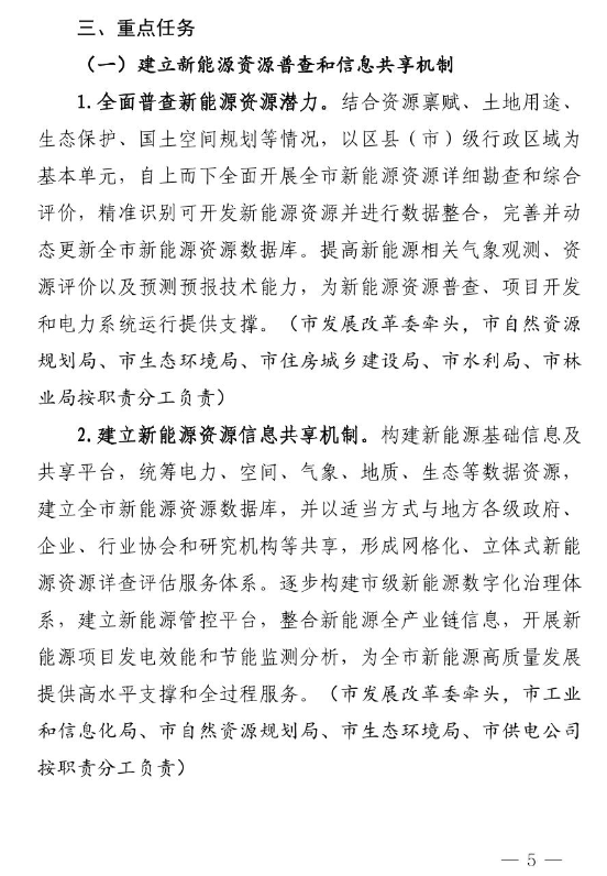 重點(diǎn)任務(wù)上,圍繞“普查資源、規(guī)劃協(xié)同、健全流程、優(yōu)化服務(wù)、用地管理、科技支撐、金融扶持、消納保障、宣傳引導(dǎo)、機(jī)制創(chuàng)新”十個(gè)方面提出30項(xiàng)具體措施,即建立新能源資源普查和信息共享機(jī)制、完善新能源發(fā)展和規(guī)劃實(shí)施的協(xié)同推進(jìn)機(jī)制、健全新能源開發(fā)利用全流程工作管理機(jī)制、優(yōu)化新能源接網(wǎng)一站式服務(wù)管理機(jī)制、加強(qiáng)新能源開發(fā)用地空間要素管理、建立全面支撐新能源發(fā)展的科技創(chuàng)新機(jī)制、建立扶持新能源發(fā)展的財(cái)政金融政策保障機(jī)制、強(qiáng)化可再生能源電力消納保障和責(zé)任機(jī)制、重視宣傳引導(dǎo)和試點(diǎn)示范效應(yīng)、建立新能源為導(dǎo)向的開發(fā)利用新機(jī)制。
