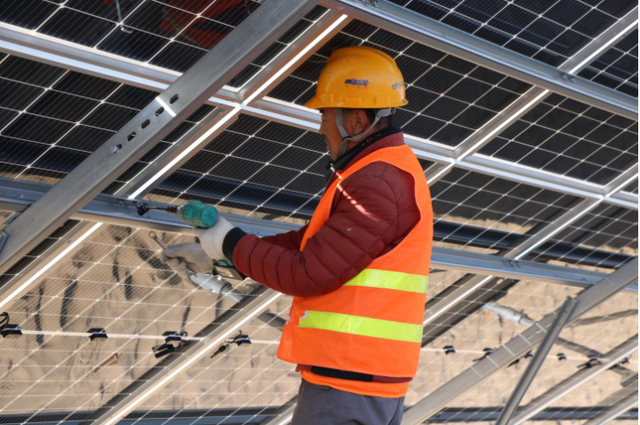 早春時節(jié),記者走進涼州區(qū)九墩灘光伏治沙示范園區(qū),魚鱗般的光伏板一塊接著一塊,一眼望不到頭,昔日連綿起伏的黃色沙丘,早已變身“藍色海洋”。在甘肅華電九墩灘50萬千瓦光伏治沙項目建設現(xiàn)場,映入眼簾的是一幅熱火朝天的繁忙景象,光伏項目的樁基加固工作如火如荼,工人們手抬肩扛,將一塊塊光伏板小心翼翼地組裝在一起……風聲、卡車轟鳴聲、吆喝聲交織在一起。