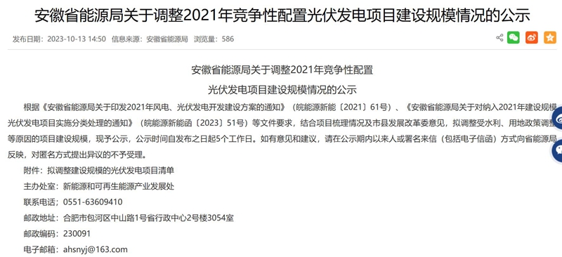 10月13日,安徽省能源局發(fā)布關(guān)于調(diào)整2021年競(jìng)爭(zhēng)性配置光伏發(fā)電項(xiàng)目建設(shè)規(guī)模情況的公示,擬調(diào)整受水利、用地政策調(diào)整等原因的項(xiàng)目建設(shè)規(guī)模,公示時(shí)間自發(fā)布之日起5個(gè)工作日。
