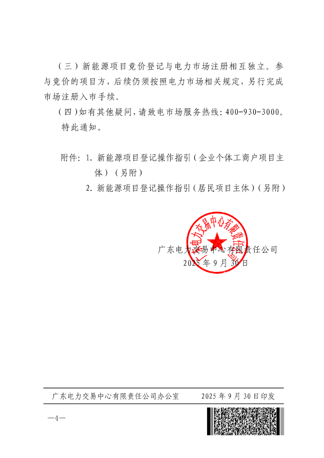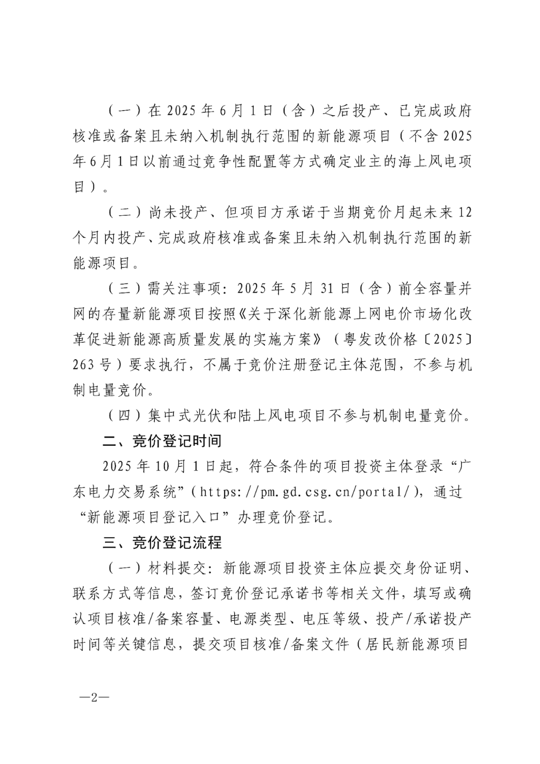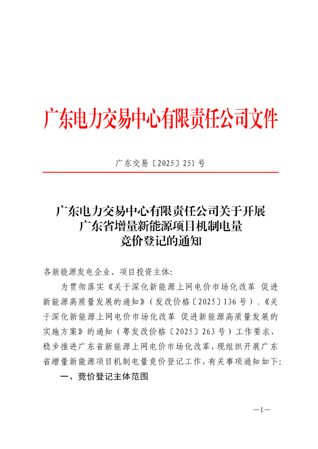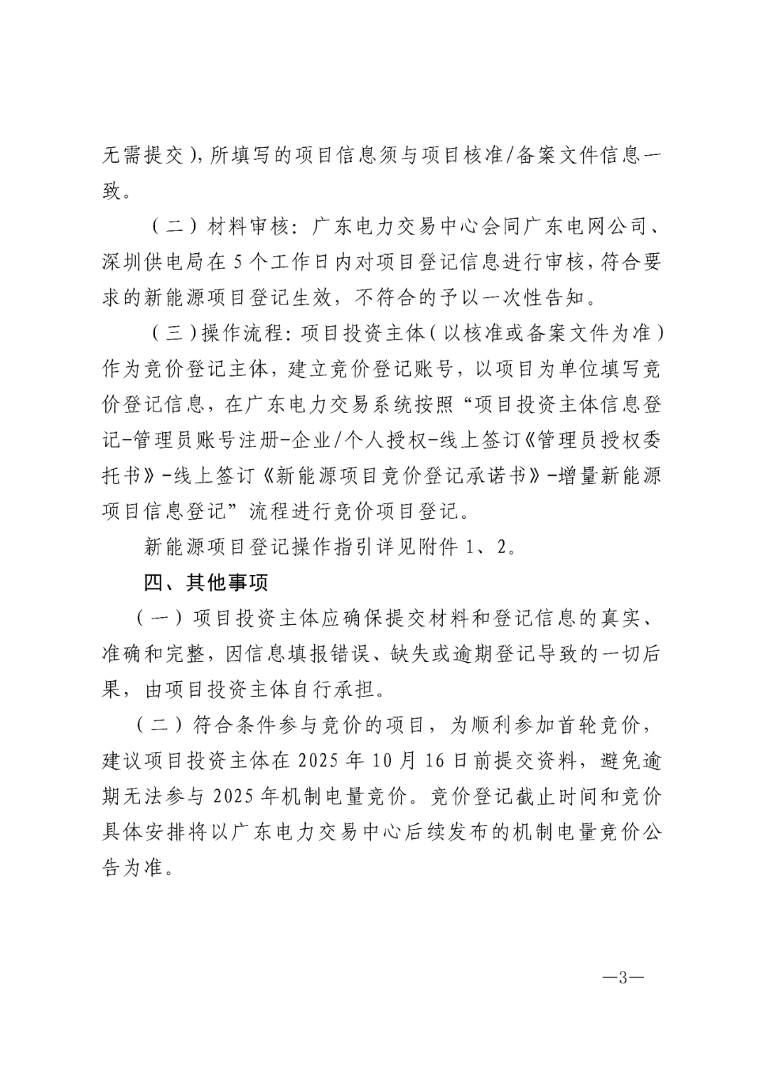9月30日,廣東電力交易中心發(fā)布《關(guān)于開(kāi)展廣東省增量新能源項(xiàng)目機(jī)制電量競(jìng)價(jià)登記的通知》明確:計(jì)劃參與機(jī)制競(jìng)價(jià)的風(fēng)電、光伏項(xiàng)目,2025年10月1日起,登錄“廣東電力交易系統(tǒng)”,通過(guò)“新能源項(xiàng)目登記入口”辦理競(jìng)價(jià)登記”,并在10月16日前提交資料,否則將無(wú)法參與競(jìng)價(jià)。