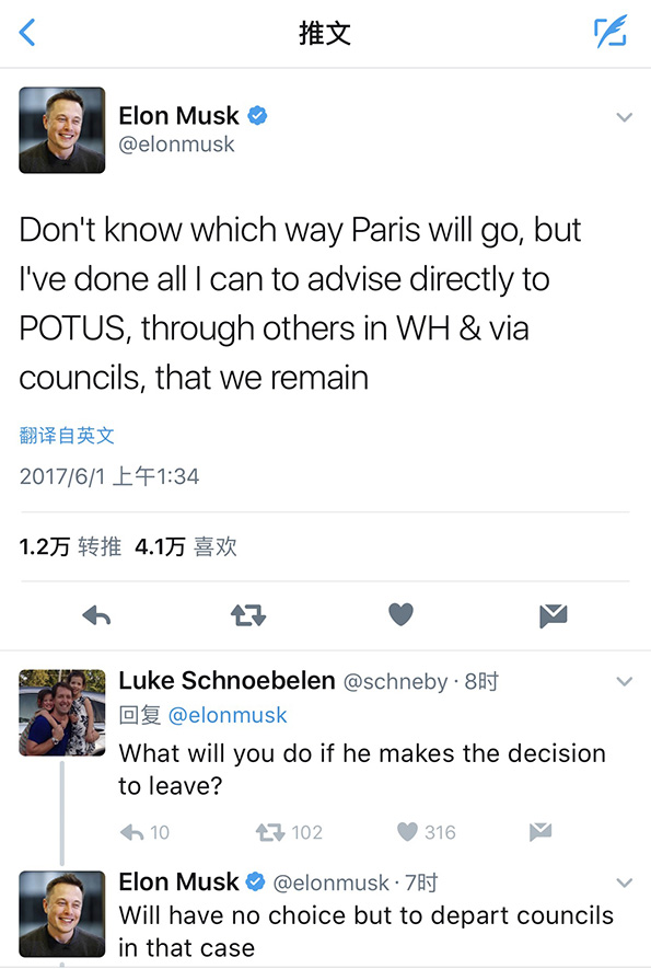 馬斯克在推特上表態(tài):“我不知道巴黎協(xié)定會(huì)如何,但是我已經(jīng)盡力通過(guò)白宮和委員會(huì),向POTUS提供建議。”