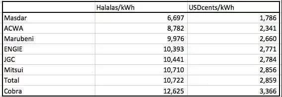 沙特阿拉伯北部Al Jouf省Sasaka 300兆瓦光伏項(xiàng)目競(jìng)標(biāo)結(jié)果10月3日揭曉:阿布達(dá)比Future Energy Co (Masdar)和法國(guó)EDF Energies Nouvelles聯(lián)合報(bào)價(jià),平準(zhǔn)成本為1.786美分/千瓦時(shí),創(chuàng)光伏報(bào)價(jià)最低紀(jì)錄。沙特阿拉伯Acwa Power公司報(bào)出2.341美分/千瓦時(shí),排在第2位;其他公司報(bào)價(jià)見(jiàn)下表。