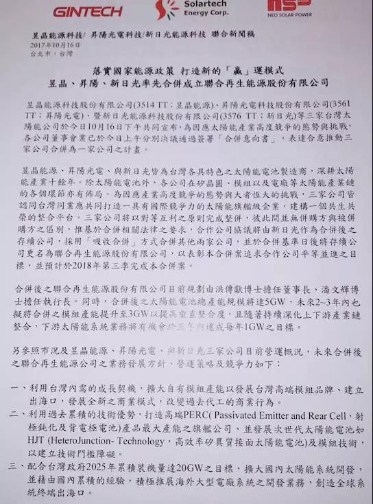 昱晶能源、升陽光電、新日光皆為臺灣各具特色之太陽能電池制造商,深耕太陽能產(chǎn)業(yè)十余年。除太陽能電池外,各公司在硅晶圓、模組以及電廠等太陽能產(chǎn)業(yè)鏈的各個環(huán)節(jié)亦有布局。為因應(yīng)產(chǎn)業(yè)高度競爭的態(tài)勢與大者恒大的挑戰(zhàn),三家公司皆認(rèn)同臺灣同業(yè)應(yīng)共同打造一具有國際競爭力的太陽能旗艦級企業(yè),建構(gòu)一個共生共榮的整合平臺。三家公司將以對等互利之原則完成整并,彼此間并無并購方與被并購方之區(qū)別,惟基于合并相關(guān)法律之要求,合作公司協(xié)議將由新日光作為合并后之存續(xù)公司,采用“吸收合并”方式合并其他兩家公司,并于合并基準(zhǔn)日后將存續(xù)公司更名為聯(lián)合再生能源股份有限公司,以表彰本合并案追求合作公司平等并進(jìn)之目標(biāo),并預(yù)計于2018年第三季完成本合并案。