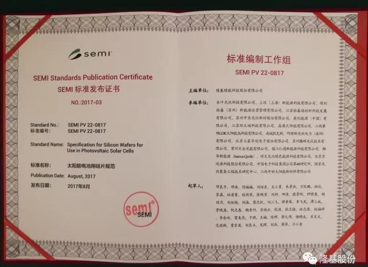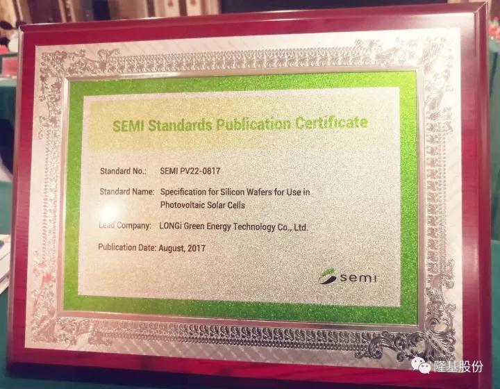 此次標(biāo)準(zhǔn)會議上,由隆基股份牽頭組織修訂的《SEMI PV22-0817硅片標(biāo)準(zhǔn)》正式面向全球發(fā)布。SEMI中國光伏標(biāo)準(zhǔn)技術(shù)委員會核心委員,一直負(fù)責(zé)推動此項標(biāo)準(zhǔn)修訂的隆基股份公共事務(wù)區(qū)域總監(jiān)鄧良平先生,代表隆基股份上臺領(lǐng)取標(biāo)準(zhǔn)發(fā)布牌!禨EMI PV22-0817硅片標(biāo)準(zhǔn)》的順利發(fā)布,標(biāo)志著隆基股份在國際性光伏標(biāo)準(zhǔn)制定方面邁出了歷史性的一步。該標(biāo)準(zhǔn)的制定部分吸收了國內(nèi)外專家提出的意見和建議,經(jīng)過組內(nèi)投票、國內(nèi)專家投票以及全球投票三大環(huán)節(jié),歷時2年時間,終獲通過,真正是可喜可賀。