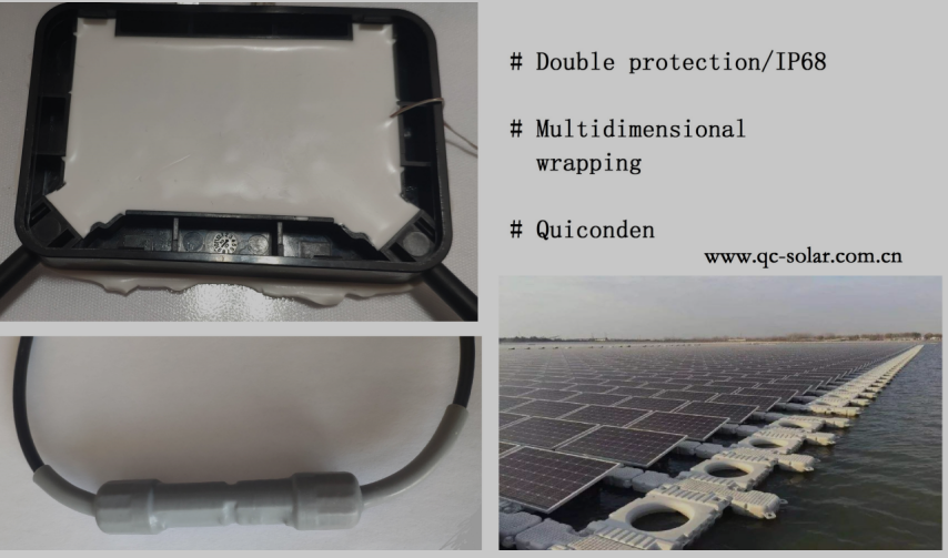該產(chǎn)品針對(duì)水面和高潮濕污染地區(qū)特點(diǎn),采用了“雙層保險(xiǎn)”設(shè)計(jì)思想,在光伏接線盒盒體內(nèi)采用“雙層絕緣壁和電路三維包覆密封技術(shù)”,使內(nèi)部電路模塊和盒體外殼在物理層面進(jìn)行了兩次完全隔離,增加了絕緣爬電距離,做到最高等級(jí)的絕緣防護(hù);在連接器端,考慮到現(xiàn)場(chǎng)安裝過(guò)程中,連接器常常安裝不到位、不規(guī)范安裝時(shí)公母插頭內(nèi)時(shí)有大量集水集塵甚至泥沙、安裝后捆扎固定不可靠、插頭常常掉落在水中或者泥土中帶電運(yùn)行,給系統(tǒng)和人員安全造成巨大風(fēng)險(xiǎn),快可光伏(QC Solar)研發(fā)團(tuán)隊(duì)針對(duì)這些問(wèn)題給出解決方案,創(chuàng)新性研究開(kāi)發(fā)了一種符合戶外條件的現(xiàn)場(chǎng)安裝常溫縮合形變密封材料和技術(shù)——快康定(Quiconden)。在光伏連接器現(xiàn)場(chǎng)安裝時(shí)搭配這種套件,該套件可以在幾分鐘內(nèi)快速產(chǎn)生縮變、緊緊包覆住整個(gè)插頭,使本來(lái)已經(jīng)防水的插頭得到額外的二次安全保護(hù),極端條件下,即便光伏插頭不慎帶電落水,也能保持系統(tǒng)安全絕緣可靠發(fā)電?炜晒夥≦C Solar)已經(jīng)申請(qǐng)了專利保護(hù),該產(chǎn)品套件為近水體光伏發(fā)電系統(tǒng)提供了更好的安全保護(hù)。