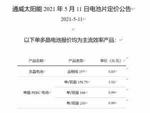 5月11日,通威官網(wǎng)發(fā)布最新電池片定價(jià)公告,距離上次報(bào)價(jià)僅隔5天。此次,通威電池片最新報(bào)價(jià)普漲6~7分/瓦。多晶157與M6電池片漲價(jià)0.07元/瓦,現(xiàn)價(jià)分別為0.83元/瓦、0.99元/瓦,漲幅為9.2% 與7.6%;G1與G12同步上調(diào)0.06元/瓦,現(xiàn)價(jià)分別為1.02元/瓦、0.99元/瓦,漲幅為6.25%與6.45%。