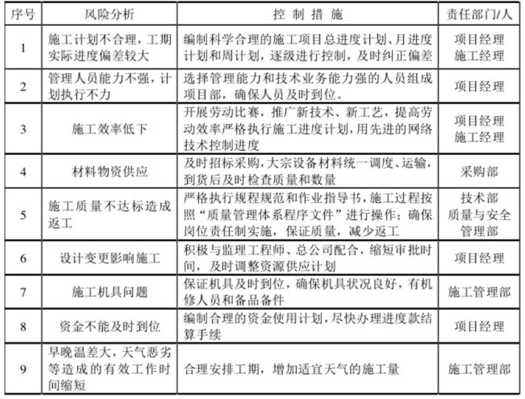 在光伏發(fā)電項(xiàng)目的實(shí)施過程中,會遇到各種阻礙項(xiàng)目進(jìn)度的情況,根據(jù)以往項(xiàng)目經(jīng)驗(yàn)及現(xiàn)場調(diào)查分析,本項(xiàng)目可能存在施工組織安排、施工效率、施工機(jī)具等方面會存在影響計(jì)劃進(jìn)度的因素。因此,要分析全面本項(xiàng)目會出現(xiàn)的風(fēng)險(xiǎn),會采取措施加以控制。如下表所示: