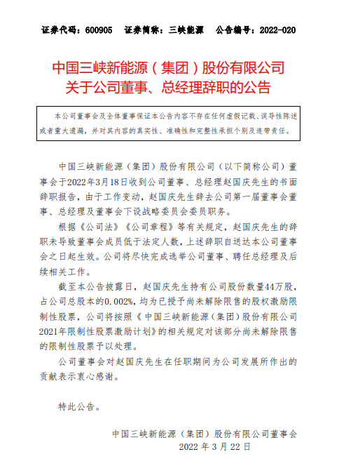 三峽新能源公告,2022年3月18日,中國三峽新能源(集團)股份有限公司董事會收到公司董事、總經(jīng)理趙國慶先生的書面辭職報告,由于工作變動,趙國慶先生辭去公司第一屆董事會董事、總經(jīng)理及董事會下設(shè)戰(zhàn)略委員會委員職務(wù)。