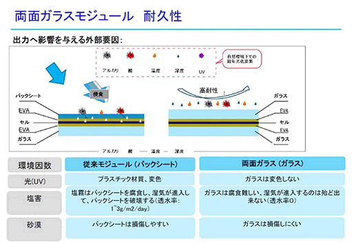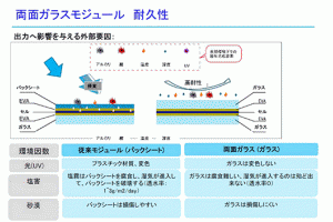 雙面玻璃太陽能電池板作為今后可提高百萬瓦級(jí)光伏電站可靠性的技術(shù)受到了關(guān)注。以前采用樹脂背板封裝時(shí)存在的課題——長期可靠性也有望得到提高。