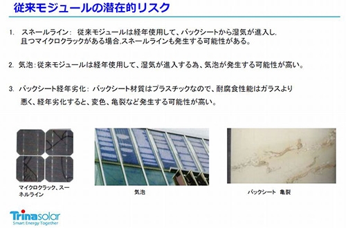 【天合光能發(fā)布】樹脂背板上的水分會(huì)引發(fā)“蝸牛紋”),繼續(xù)介紹中國大型太陽能電池板廠商的日本法人天合光能日本公司(東京都港區(qū)),就利用雙面玻璃太陽能電池板提高可靠性技術(shù)的發(fā)布會(huì)內(nèi)容。以往采用樹脂背板的太陽能電池板存在的可靠性課題,可通過用兩枚玻璃夾住電池板