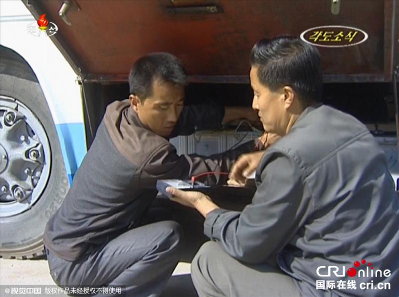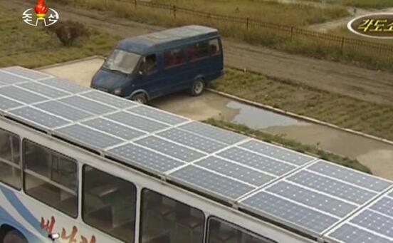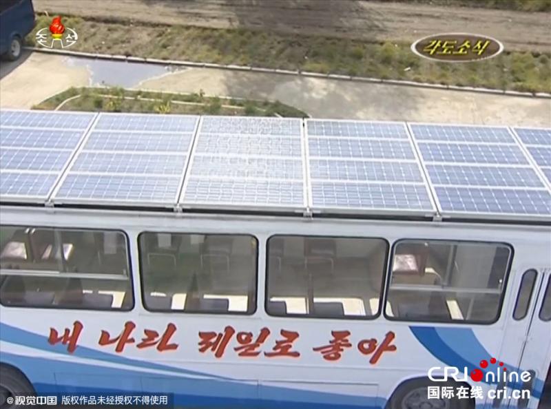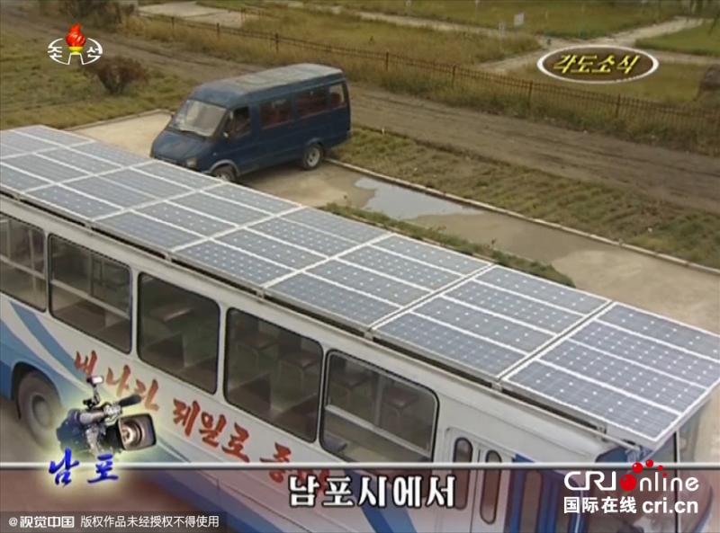 2015年11月3日消息,朝鮮中央電視臺播放的畫面顯示,朝鮮正在開發(fā)運(yùn)行新動力能源的公交車。這些南浦市的新公交車搭載32塊1100瓦特的太陽能電池板,同時配備電動機(jī),最多可搭載140人,最高時速為每小時40千米。圖片來源:視覺中國