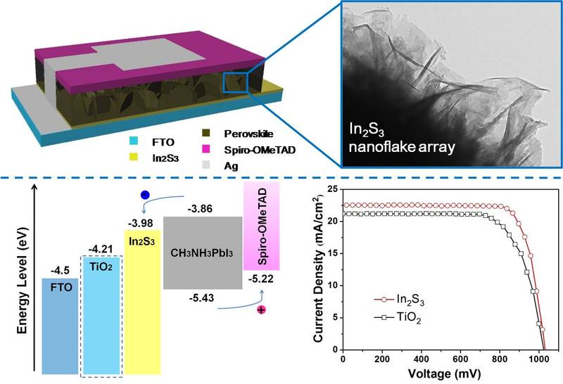 鈣鈦礦太陽能電池(PSCs)由于其能量轉(zhuǎn)換效率高、成本低廉和制備工藝簡單等優(yōu)點(diǎn),引起了科研工作者的廣泛關(guān)注。電子傳輸層(ETL)作為鈣鈦礦太陽能電池的重要組件之一,可以選擇性傳輸光生電子,抑制載流子復(fù)合,對電池能量轉(zhuǎn)換效率的提高具有重要意義。針對目前傳統(tǒng)ETL材料與鈣鈦礦層本征電子遷移率不匹配這一關(guān)鍵問題,該工作采用低溫化學(xué)浴沉積方法制備了排列規(guī)整的In2S3納米片陣列,并將其首次應(yīng)用于鈣鈦礦太陽電池ETL的結(jié)構(gòu)設(shè)計(jì)中。