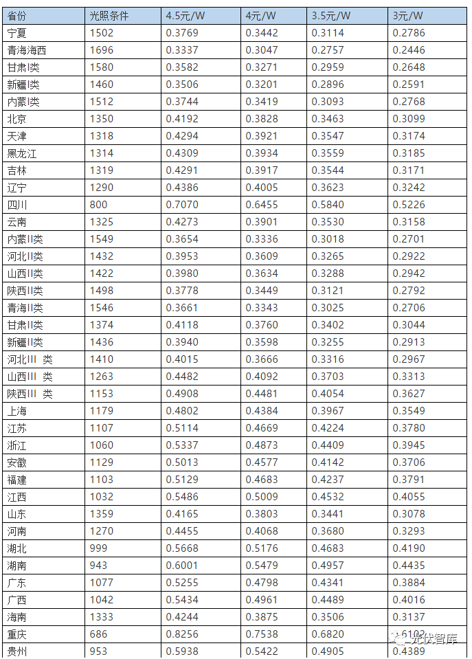 根據(jù)目前降本趨勢,預(yù)計(jì)2020年底光伏電站建設(shè)成本平均在3.5元/W左右,此時(shí)度電成本為0.36元/度。