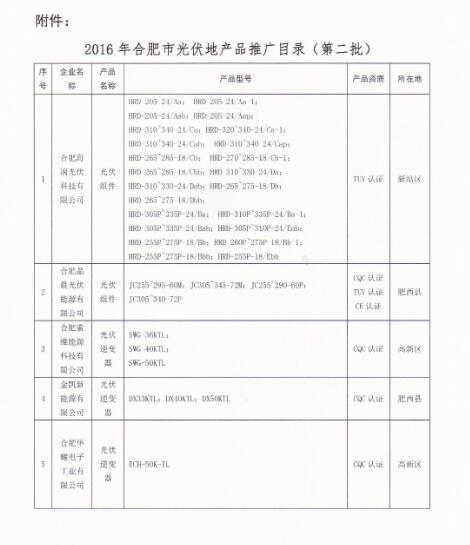10月28日,合肥市經(jīng)信委、發(fā)改委以及質(zhì)監(jiān)局聯(lián)合發(fā)布《2016年合肥市光伏地產(chǎn)品推廣目錄(第二批)》的通知。