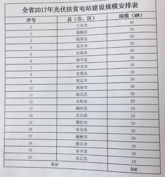 8月29日,吉林省能源局、吉林省扶貧開發(fā)領(lǐng)導(dǎo)辦公室聯(lián)合下發(fā)了吉能新能聯(lián)【2017】292號——《關(guān)于做好2017年集中式光伏扶貧項目申報工作的通知》(以下簡稱《通知》)!锻ㄖ芬,2017年國家下達吉林省的500MW新增光伏電站指標將全部用于集中式光伏扶貧電站,由省級分解下達至各縣(市、區(qū))統(tǒng)籌安排使