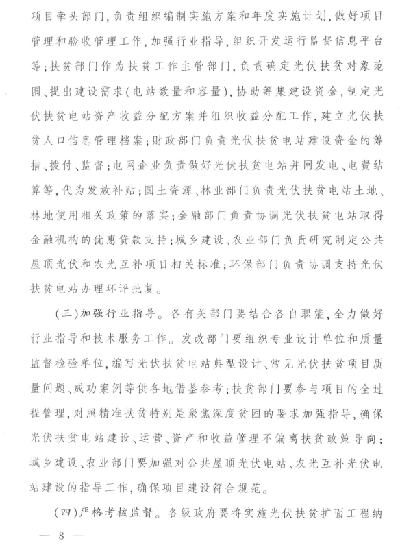 6月23日,習(xí)近平總書記在深度貧困地區(qū)脫貧攻堅(jiān)座談會(huì)上再次強(qiáng)調(diào)指出“在具備光熱條件的地方實(shí)施光伏扶貧,建設(shè)村級(jí)光伏電站,通過收益形成村集體經(jīng)濟(jì),開展公益崗位扶貧、小型公益事業(yè)扶貧、獎(jiǎng)勵(lì)補(bǔ)助扶貧,這些是解決深度貧困的好辦法”。根據(jù)中央脫貧攻堅(jiān)決策部署和中央領(lǐng)導(dǎo)同志關(guān)于光伏扶貧的重要論述,國務(wù)院扶貧辦會(huì)同各部委在2017年出臺(tái)了或即將出臺(tái)一系列光伏扶貧配套政策:會(huì)同國家能源局出臺(tái)《關(guān)于“十三五”光伏扶貧計(jì)劃編制有關(guān)事項(xiàng)的通知》并即將出臺(tái)《光伏扶貧電站管理辦法》,會(huì)同國土資源部即將出臺(tái)《關(guān)于促進(jìn)光伏發(fā)電產(chǎn)業(yè)健康發(fā)展用地的意見》,指導(dǎo)國家電網(wǎng)公司、南方電網(wǎng)公司研究出臺(tái)簡化電費(fèi)結(jié)算流程、提高發(fā)電并網(wǎng)消納方面的支持政策。同時(shí),國務(wù)院扶貧辦正在制定《光伏扶貧電站收益分配管理辦法》,規(guī)范和完善光伏扶貧收益分配機(jī)制,并在會(huì)同國家標(biāo)準(zhǔn)委制定光伏扶貧國家標(biāo)準(zhǔn)的基礎(chǔ)上發(fā)布光伏扶貧工作指南,進(jìn)一步強(qiáng)化對(duì)各地開展光伏扶貧的指導(dǎo)和監(jiān)管。
