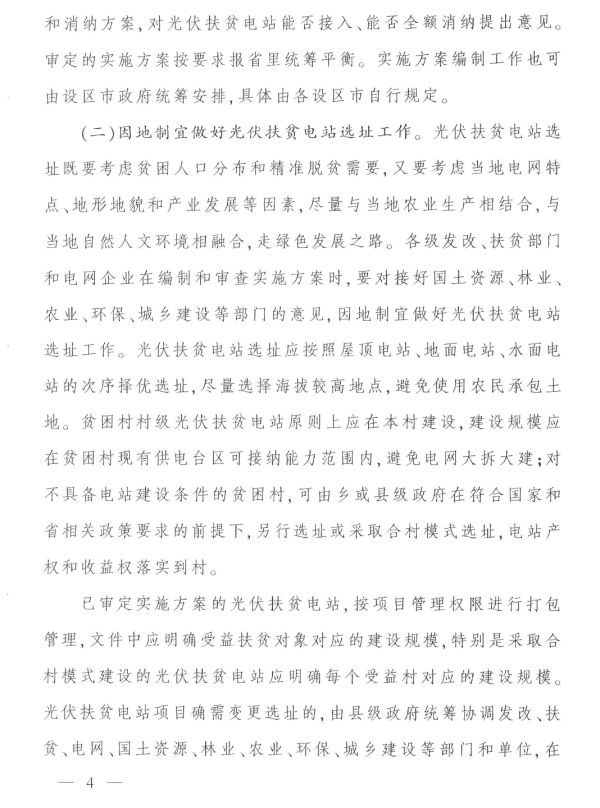 第二部分,關(guān)于光伏扶貧擴(kuò)面工程的實(shí)施內(nèi)容。實(shí)施內(nèi)容是以村級(jí)光伏扶貧電站為主,力爭(zhēng)用1-2年時(shí)間,加快村級(jí)光伏電站對(duì)實(shí)施《中國農(nóng)村扶貧開發(fā)綱要(2011-2020)》扶持建檔立卡貧困村的全覆蓋,每個(gè)村的電站規(guī)模為100千瓦,每個(gè)電站每年為每村增加4-5萬元集體經(jīng)濟(jì)收入。已建設(shè)光伏扶貧電站規(guī)模不足100千瓦的貧困村,可根據(jù)本村建設(shè)條件和精準(zhǔn)扶貧需求,補(bǔ)足建設(shè)至100千瓦。