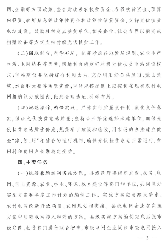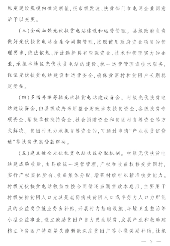 第四部分,關(guān)于擴(kuò)面工程實(shí)施的主要任務(wù)。按照因地制宜,科學(xué)布局和規(guī)范操作,確保實(shí)效的基本原則,提出了統(tǒng)籌兼顧編制實(shí)施方案、因地制宜做好光伏扶貧電站選址工作、全面加強(qiáng)光伏扶貧電站建設(shè)和運(yùn)營管理、多措并舉籌措光伏扶貧電站建設(shè)資金、建立健全光伏扶貧電站收益分配機(jī)制五方面主要任務(wù)。