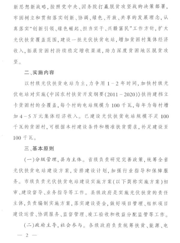 第一部分,關(guān)于擴(kuò)面工程的總體要求。要求各地各部門全面貫徹落實(shí)黨的十八大和十八屆三中、四中、五中、六中全會(huì)精神,深入貫徹習(xí)近平總書記重要講話精神和治國理政新理念新思想新戰(zhàn)略,按照黨中央、國務(wù)院打贏脫貧攻堅(jiān)戰(zhàn)的決策部署,牢固樹立和貫徹落實(shí)創(chuàng)新、協(xié)調(diào)、綠色、開放、共享的發(fā)展理念,認(rèn)真落實(shí)創(chuàng)新引領(lǐng)、綠色崛起、擔(dān)當(dāng)實(shí)干、興贛富民工作方針,擴(kuò)大光伏扶貧覆蓋范圍,建設(shè)一批光伏扶貧電站,增加貧困村集體經(jīng)濟(jì)收入,拓展貧困村持續(xù)穩(wěn)定增收渠道,助力深度貧困地區(qū)脫貧攻堅(jiān)。