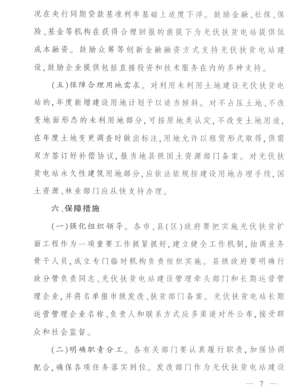 第五部分,關(guān)于支持?jǐn)U面工程實(shí)施的優(yōu)惠政策,為推進(jìn)光伏扶貧擴(kuò)面工程的順利高效實(shí)施,從建設(shè)指標(biāo)、度電補(bǔ)貼、電網(wǎng)接入、金融支持、保障用地這五方面分別提出了支持政策,為村級(jí)扶貧電站助力脫貧攻堅(jiān)鋪平了道路。