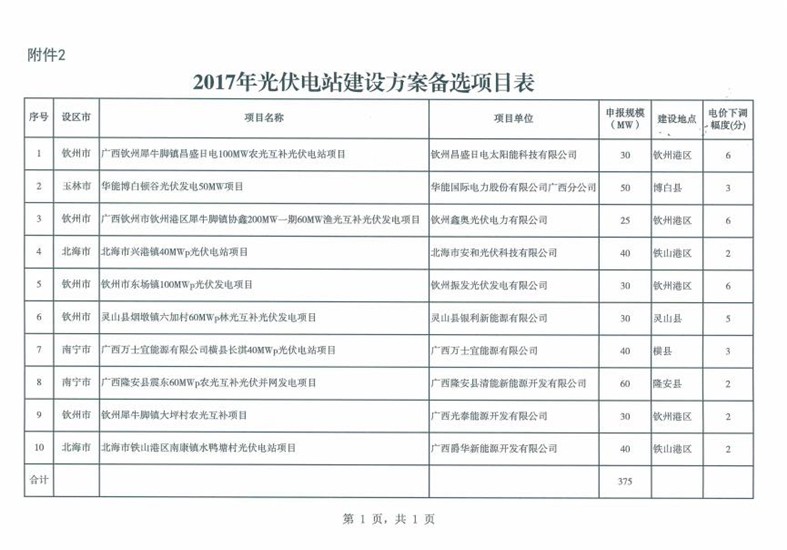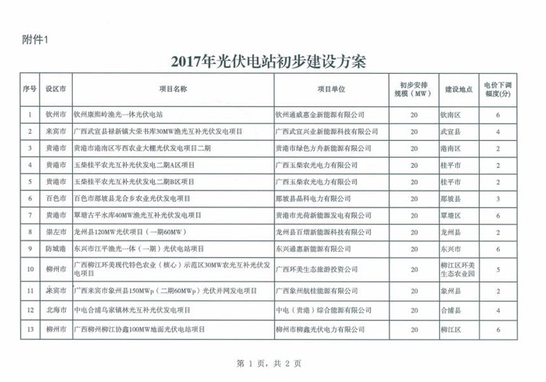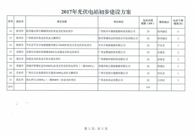 廣西2017年普通光伏電站新增建設(shè)規(guī)模初步安排 總規(guī)模418MW