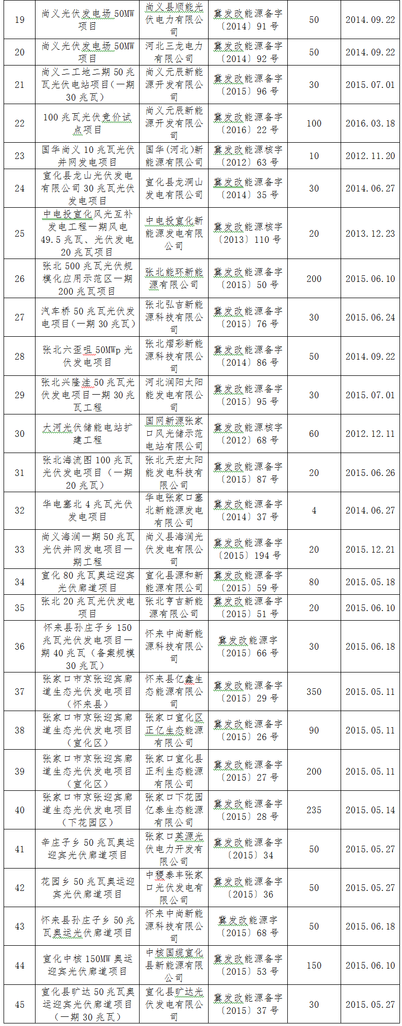 按照河北省能源局《關(guān)于一次性報送光伏發(fā)電項目備案證過期影響土地、環(huán)評、發(fā)電許可等手續(xù)辦理出具意見請示的通知》要求,張家口市共上報項目46個、備案規(guī)模3009兆瓦(其中含風(fēng)電項目1個、400兆瓦)。經(jīng)審核,符合要求的光伏發(fā)電項目共45個、備案規(guī)模2609兆瓦。