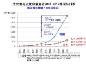 對2011年日本與德國的太陽能發(fā)電狀況進(jìn)行比較可以發(fā)現(xiàn),累計裝機(jī)容量(500萬千瓦對2500萬千瓦)以及年新裝機(jī)容量(130萬千瓦對750萬千瓦),日本都僅為德國的5分之1左右。