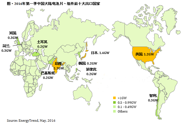 今年第一季中、美、日、印等光伏需求大國積極拉貨,但自第二季起,電站廠商普遍預(yù)期模塊價格將持續(xù)緩跌,因此除了并網(wǎng)時限急迫的印度外,其余市場需求力道大多趨緩,產(chǎn)業(yè)步入淡季。