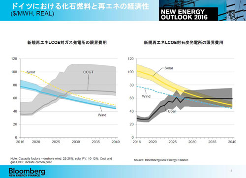 圖3:德國新導入的光伏、風力發(fā)電及天然氣、煤炭火力發(fā)電的極限費用(出處:BNEF)