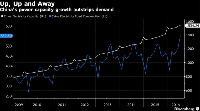 不過,電力消耗的增速正在放緩。國(guó)家統(tǒng)計(jì)局的數(shù)據(jù)顯示,2010年,用電量上升了15%,但在最近過去的兩年中僅上升6.1%。但近兩年電裝機(jī)容量增長(zhǎng)22%,2004年到2010年,中國(guó)電裝機(jī)容量增加了一倍。Bloomberg Intelligence匯總的數(shù)據(jù)顯示,電力需求的增速甚至已經(jīng)不及放緩中的GDP增速的一半。
