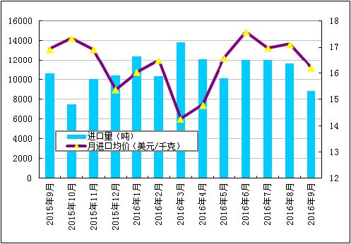 圖1 2015年9月-2016年9月多晶硅進(jìn)口量及進(jìn)口均價(jià)示意圖 數(shù)據(jù)來(lái)源:海關(guān)