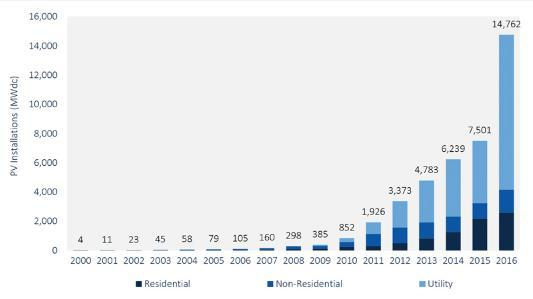 另外,美國(guó)對(duì)于當(dāng)?shù)毓夥a(chǎn)業(yè)的發(fā)展也持鼓勵(lì)態(tài)度。據(jù)前瞻產(chǎn)業(yè)研究院《中國(guó)光伏發(fā)電產(chǎn)業(yè)市場(chǎng)前瞻與投資戰(zhàn)略規(guī)劃分析報(bào)告》的統(tǒng)計(jì),2016年美國(guó)光伏裝機(jī)量已近個(gè)達(dá)到14.8GW,與2015年相比增幅將近100%,這一增長(zhǎng)來自于37萬家用戶對(duì)光伏發(fā)電的認(rèn)可。