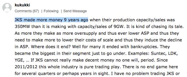 這幾天一直在看SA上的帖子的評(píng)論,kukukki下面這個(gè)帖子寫的有點(diǎn)沮喪,大意是說9年以前晶科每年賣350MW的組件,現(xiàn)在賣9GW組件,但是公司賺的錢卻比9年前的還少。
