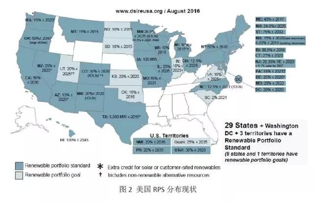 其中,強(qiáng)制市場(chǎng)主要發(fā)生在批發(fā)市場(chǎng),是為滿足當(dāng)?shù)氐目稍偕茉磁漕~目標(biāo)(RPS)而產(chǎn)生的,目前美國(guó)已有29個(gè)州以及華盛頓哥倫比亞特區(qū)實(shí)施了RPS(圖2)。由于配額目標(biāo)多針對(duì)電力供應(yīng)商,即要求其提供給用戶的電量中有一定比例的非水可再生能源電量,所以電力供應(yīng)商是強(qiáng)制市場(chǎng)的主要買(mǎi)方。為滿足配額要求,電力供應(yīng)方或通過(guò)提高自身非水可再生電力供應(yīng)比例,或選則在強(qiáng)制市場(chǎng)購(gòu)買(mǎi)綠證,電力供應(yīng)商的履約成本將均勻傳導(dǎo)至其供電范圍內(nèi)的所有用戶。