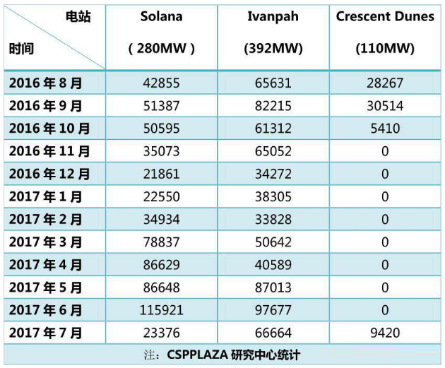 Solana槽式電站配6小時(shí)儲(chǔ)熱,設(shè)計(jì)年發(fā)電量為944000MWh,于2013年10月正式并網(wǎng)發(fā)電。Ivanpah塔式水工質(zhì)電站無(wú)儲(chǔ)熱,PPA協(xié)議年供電量為975000MWh,于2014年2月13日正式并網(wǎng)投運(yùn)。新月沙丘熔鹽塔電站配10小時(shí)儲(chǔ)熱,設(shè)計(jì)年發(fā)電量為500000MWh,于2016年2月份正式并網(wǎng)投運(yùn)。這三個(gè)大型光熱電站自2016年8月至2017年7月的月度發(fā)電量如下表所示。