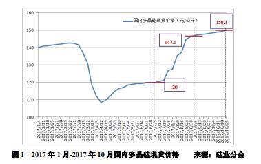 2017年9-10月份多晶硅價(jià)格持穩(wěn)微漲,從9月初的14.71萬元/噸,上漲到10月底的15.01萬元/噸,增幅僅有2.0%,相比7-8月份的價(jià)格漲幅21.9%增速有所放緩。10月份多晶硅均價(jià)14.95萬元/噸,環(huán)比增加1.3%。
