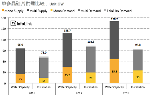 觀察單晶硅片產(chǎn)能在2016年底僅25GW,而2017Q1-Q2單晶硅片產(chǎn)能并未開始明顯成長之時,需求卻快速攀升,讓單晶硅片在今年上旬一直面臨供不應求的態(tài)勢。隨今年下半單晶硅片龍頭廠隆基、中環(huán)大舉擴充產(chǎn)能,年底單晶硅片產(chǎn)能已達45.2GW,應付明年度需求已綽綽有余,且明年產(chǎn)能仍持續(xù)拓展,使得2018年單晶硅片再也不會是光伏供應鏈內(nèi)的瓶頸環(huán)節(jié),價格的下探可期。